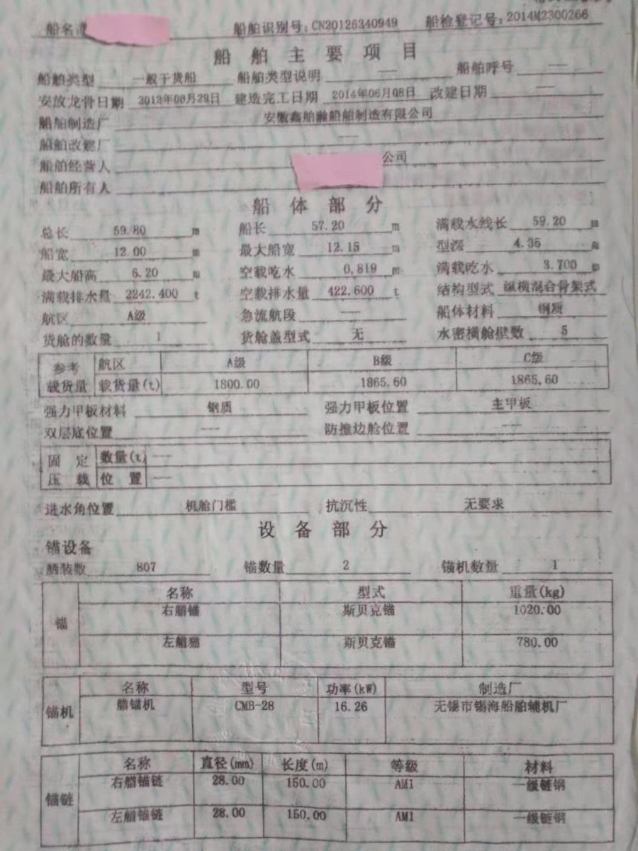 吉船出售:59.8/12/4.35米,14年6月建于安微鑫舶瀚船厂,总吨数952t,主机潍柴408x2马力,前驾固定.通仓双站:甲板.大川10个,外壳全8个船板,二层板10个,包双站19道顺龙筋50下料,主龙筋:1道12个.2道10个,其余7.75板,全部丁字型复条,双站内结构一副一强,每边5道大刀片,仓口39米,后楼1.9米,淮南港,机划子.污水处理器.雷达.卫导.测水仪等设备齐全,开价230万