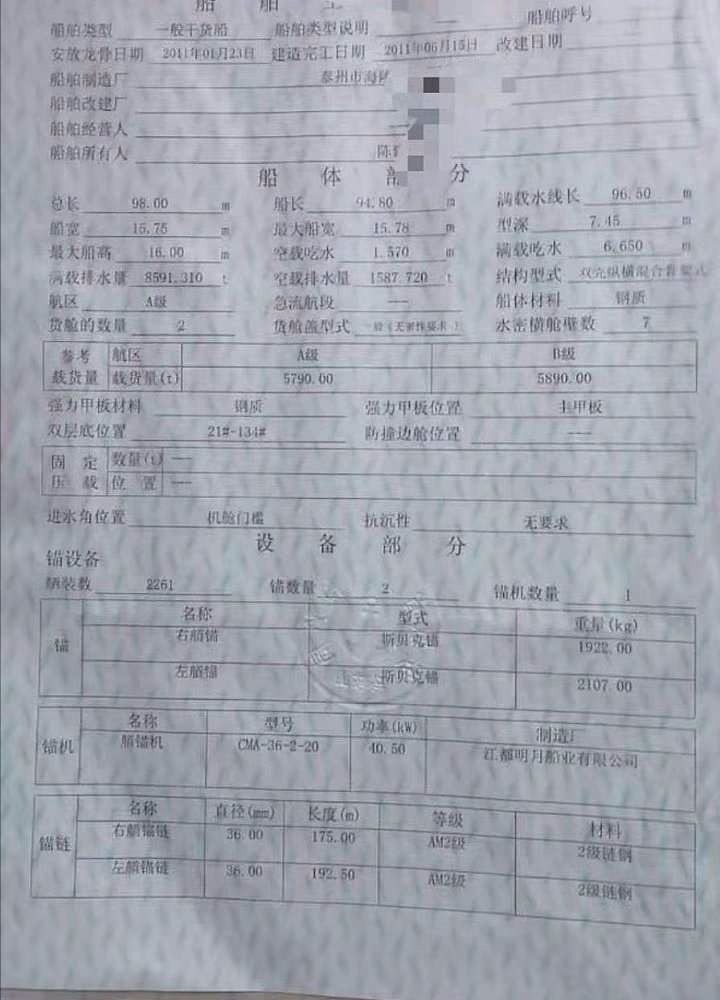 出售8050吨干货船,98x15.75x7.45,重柴6200x2台,2011年6月泰州造,小三楼.尖头.满梁.双走赶,龙筋9道x1.05下料,仓口65米,质量ok《总吨3465.挂户安徽》报价588万