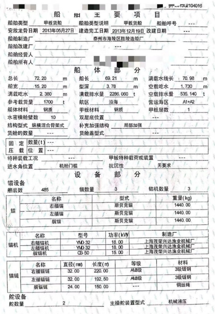 吉船长宽深:72.2米+15.25米+3.78米; 主机型号:6200;