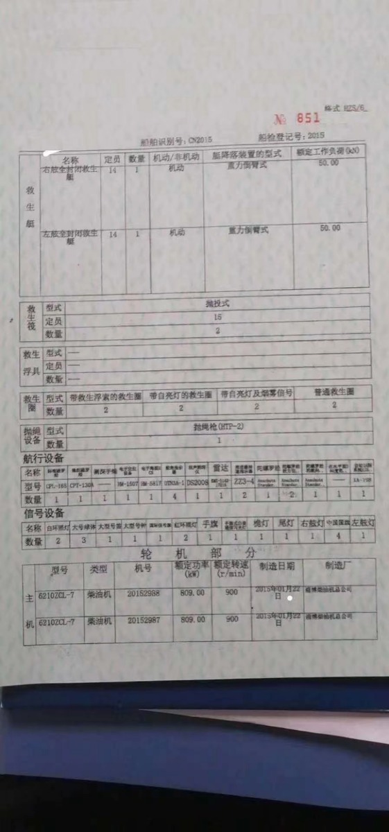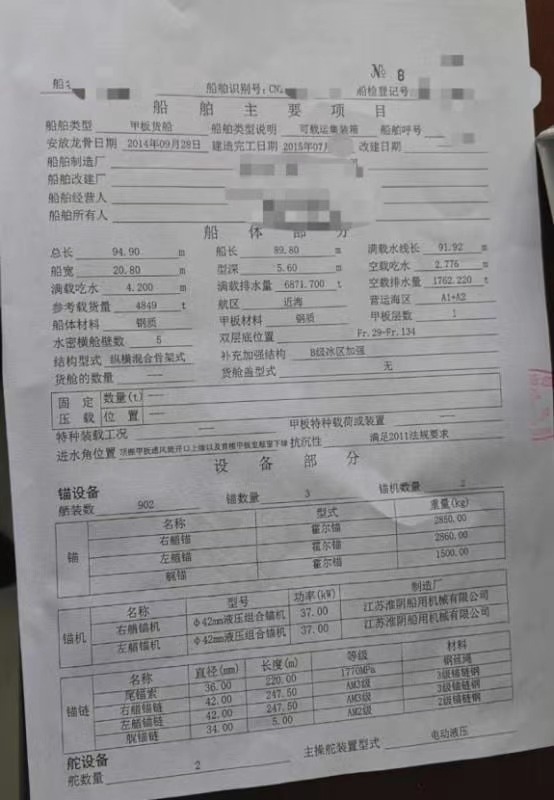 本船配备有集装箱系固设备,可装运集装箱,总箱位156个标箱,该船设计主要装载可装大件,主机额定功率809.00千瓦X2台,制造厂:淄博柴油机总公司,制造日期2015年1月22日(该船主机燃烧重柴油)