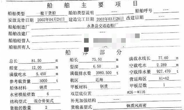 吉船长宽深:81.5米+12米+2.5米; 主机型号邵后提供