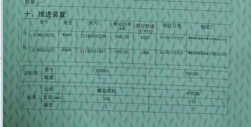 主机型号:潍柴6200 698kw;