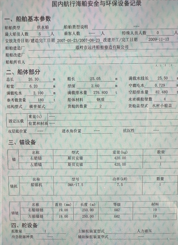 2009年26.3米249吨供水船;
