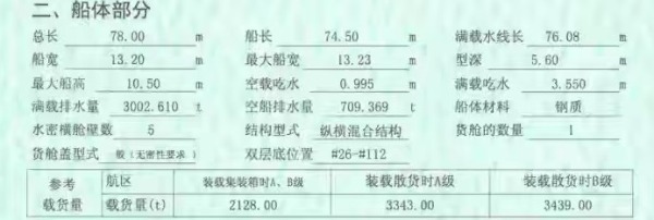 78×13.2x5.6,A级航区2100吨,B级航区3343吨