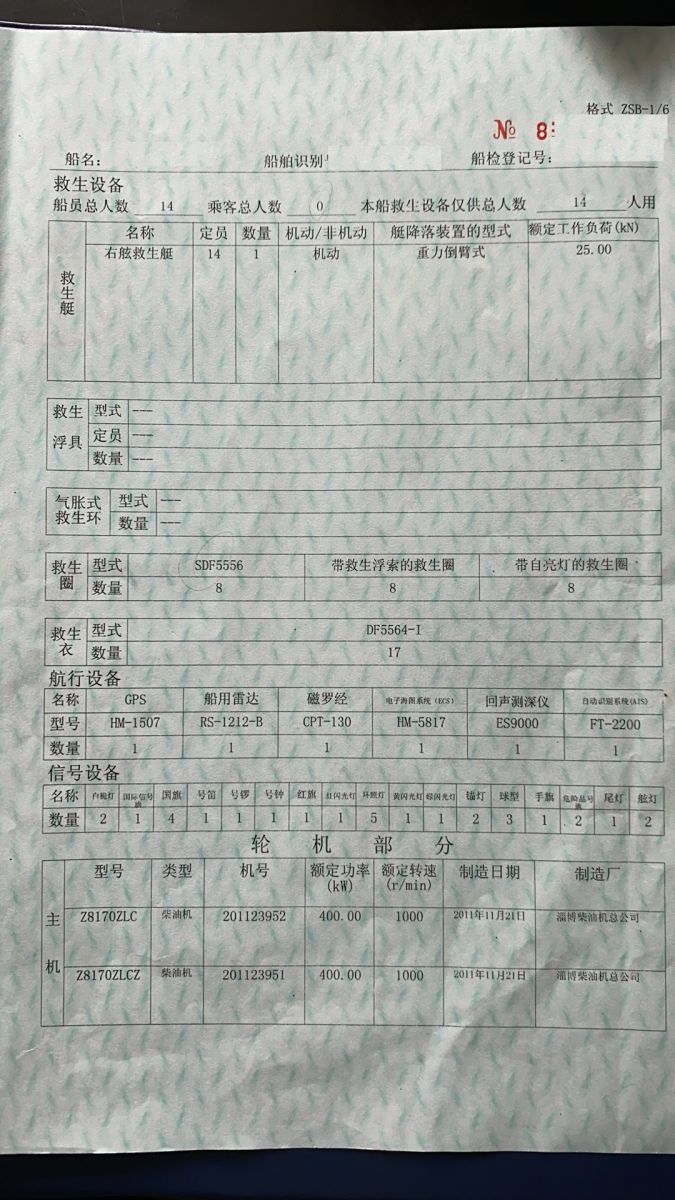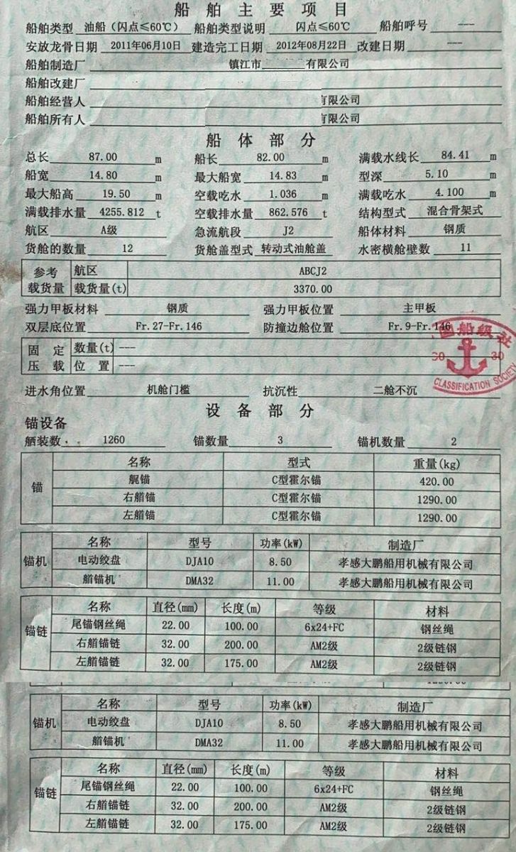 2012年87米4255吨油船 吉船长宽深:87米14.8米5.1米; 主机型号:8170; 登记报价1258万