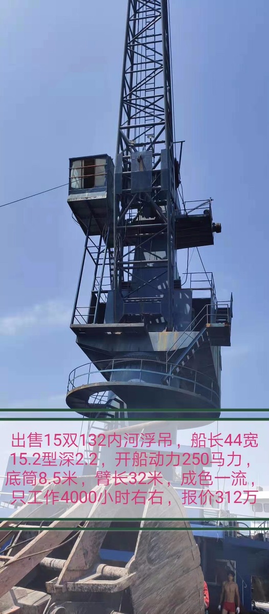出售2015双132内河浮吊,内河证书,船长44米宽15.2型深2.3米,开船动力350马力X2,底筒8.5米