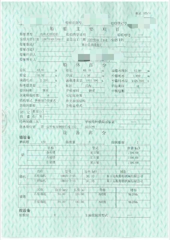 吉船长宽深:62.8米+16米+4.3米; 主机型号:中策;