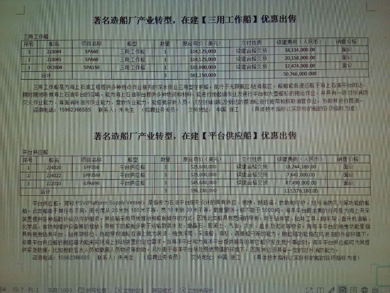 2 ZJ4022 SPP35M 平台供应船 1 $25,000,000 续建合格交货 7,642,000.00 面议