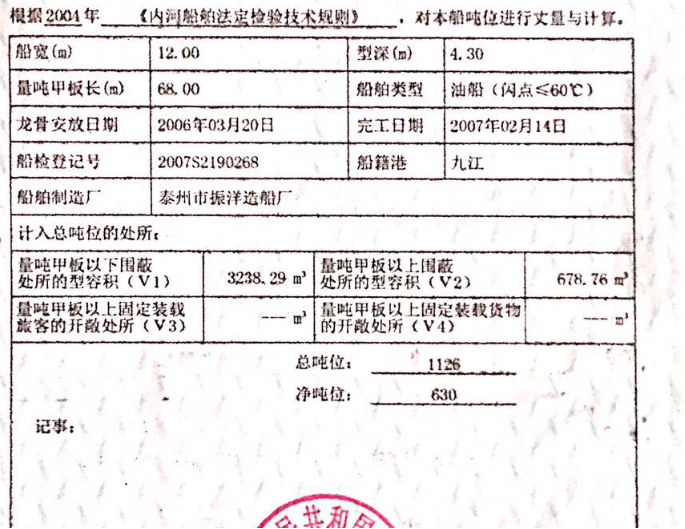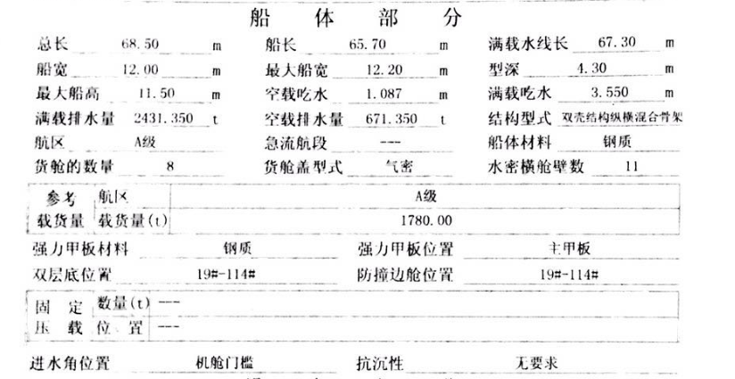 吉船长宽深:68.5米+12米+4.3米; 主机型号:6170x2 两台 440KW ;