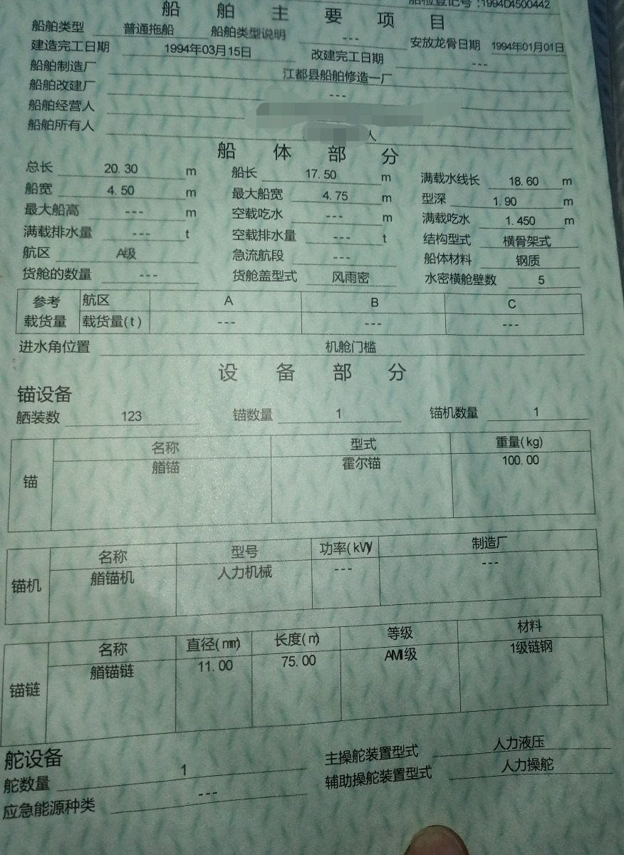 吉船长宽深:20.3米+4.5米+1.9米; 主机型号:潍柴204;