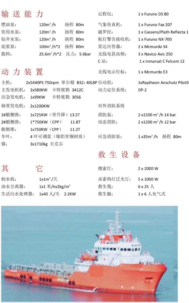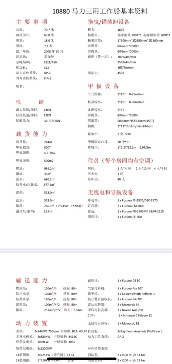 出租售10880马力三用工作船,出厂年份2008年,船级社CCS,无限航区,主机船况好