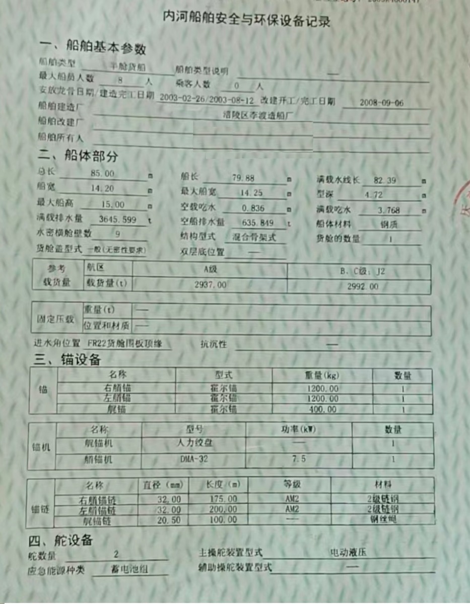 吉船长宽深:85米+14.2米+4.72米; 主机型号:潍柴6170;