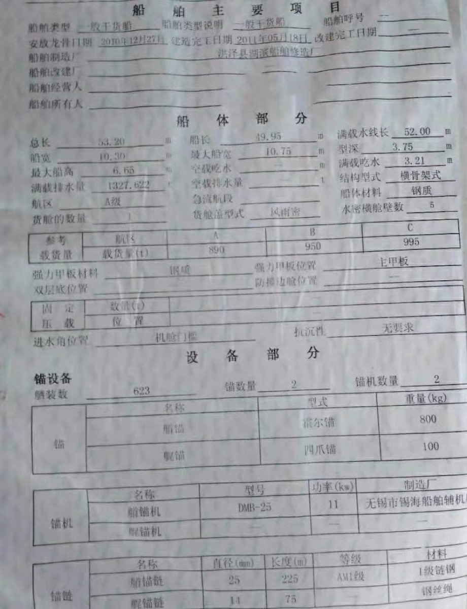 吉船53.2*10.3*3.75前驾驶一楼半,2011年5月洪泽造江苏户;用料15到龙55双站通仓,板厚底挂二层8,水甲川10;仓口下面33.5上面31.5,后楼高1.9米,最大宽10.75米,总吨592,主机潍柴275*2;报价152.8万。